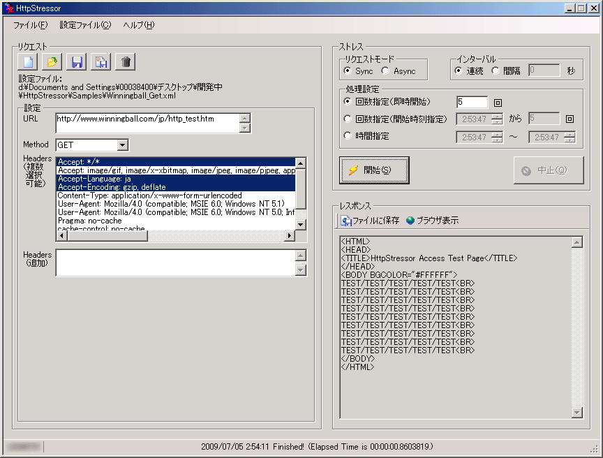 HTTPリクエストのGETメソッドを使ってWebサーバーに5回連続アクセスした時の実行結果(サンプル)。